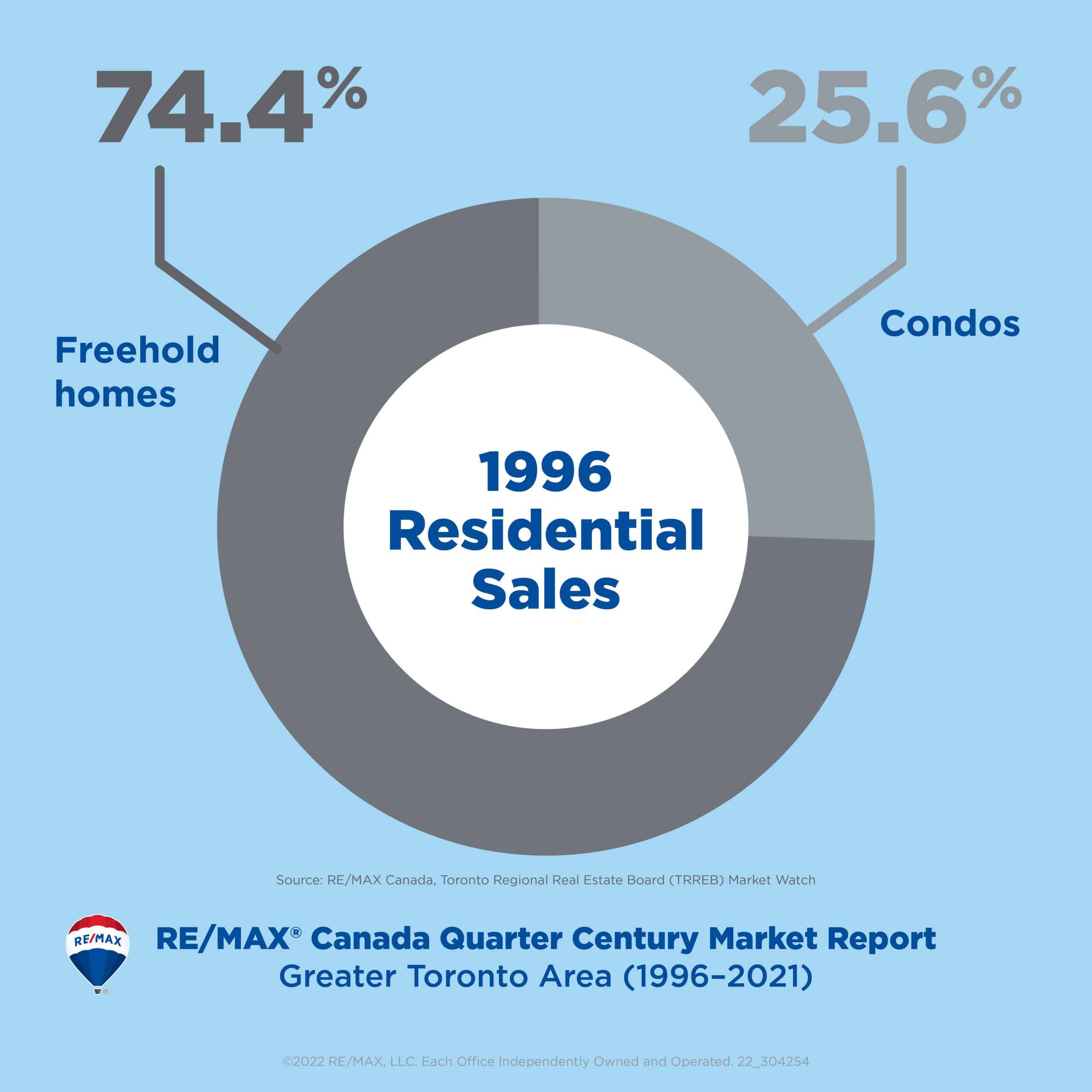 Residential unit sales in the Greater Toronto housing market have doubled and average price has increased more than 450 per cent since 1996, as strong demand and limited supply continue to drive rapid price escalation throughout the 416 and 905 area codes, according to a new report released by RE/MAX Canada.