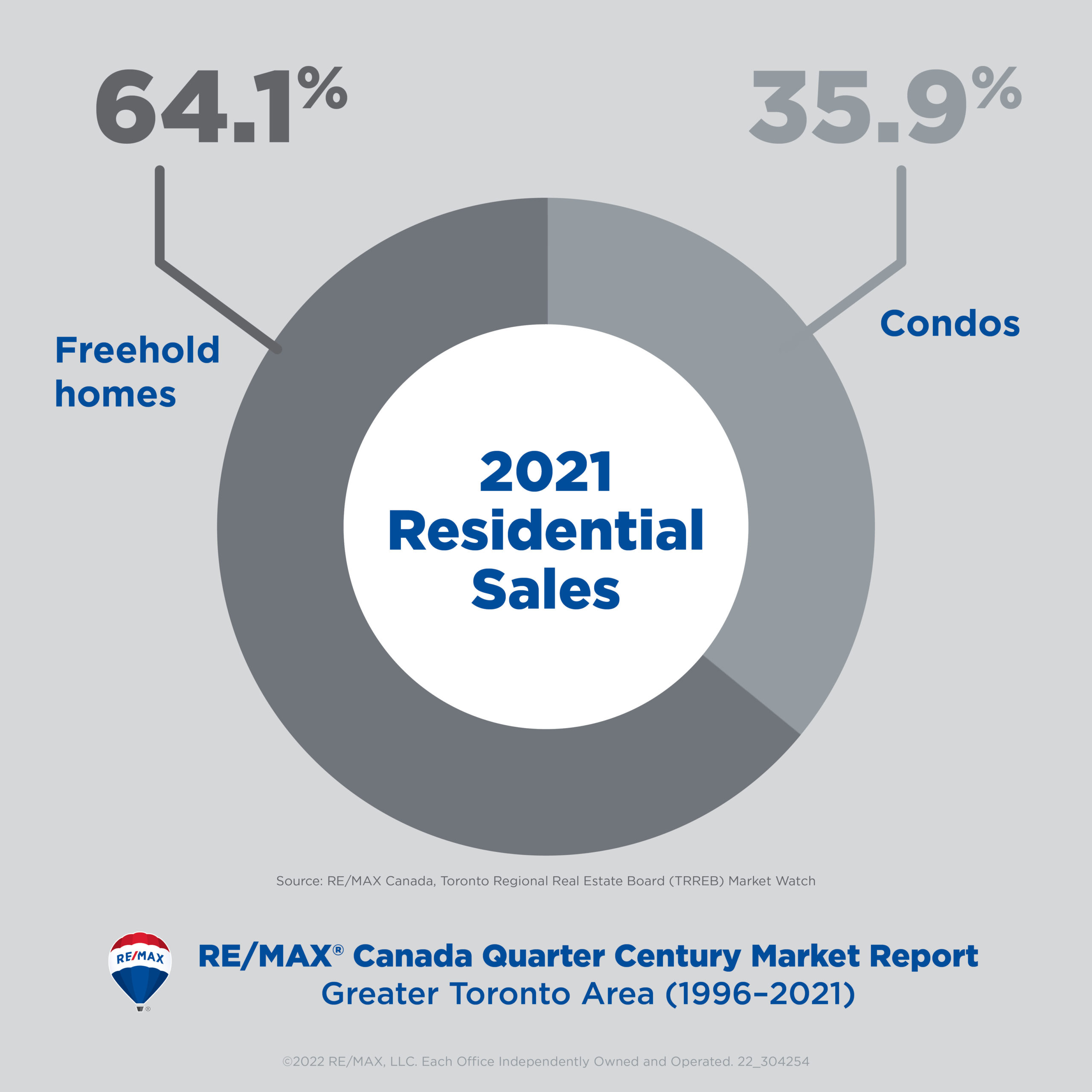 The RE/MAX Canada Quarter Century Market Report analyzed home-buying activity in the nine Toronto Regional Real Estate Board (TRREB) districts that comprise the GTA – Toronto East, Toronto West, Toronto Central, Durham, Halton, Peel and York Regions, and Simcoe and Dufferin Counties – and found land availability, especially in the city’s core and bedroom communities, has waned. This, as migration, low interest rates, and affordability continue to play a critical role in the growth of the GTA. Triple-digit increases in sales were noted in Toronto Central, Halton Region, York Region, Simcoe County and Dufferin County over the past 25 years, while average sale prices reached new heights across the greater Toronto housing market, with percentage increases climbing between 1996 and 2021, from a low of 301 per cent in Toronto Central, to a high of 874 per cent in York Region.