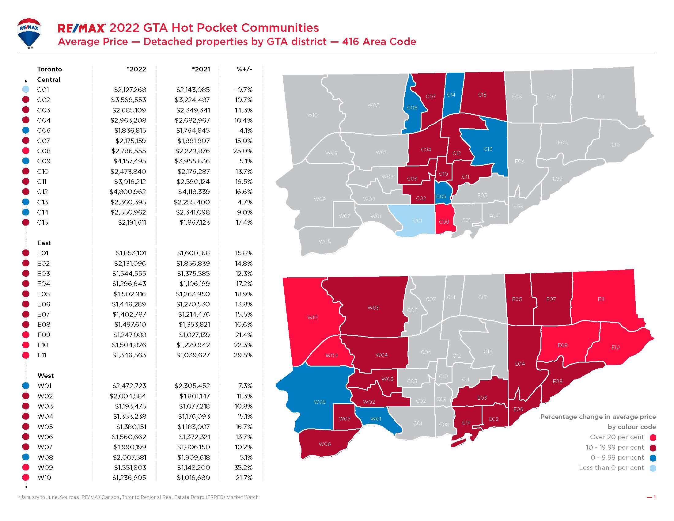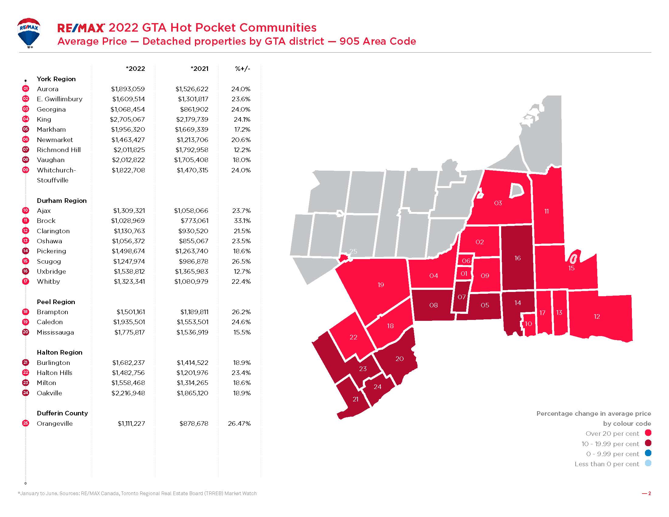 RE/MAX REALTORS® also noted a reversal in pandemic trends over the past six months, as work-from-home situations change and buyers rethink the exodus to suburban and rural areas. Second-quarter detached home sales rose year-over-year in 40 per cent (24/60) of regions across the Greater Toronto housing market, with the vast majority of increases noted the 416 area code (20/60). However, affordable price points also continued to draw buyers. Durham Region was also a hot spot with half of its markets reporting an uptick in home-buying activity (4/8).