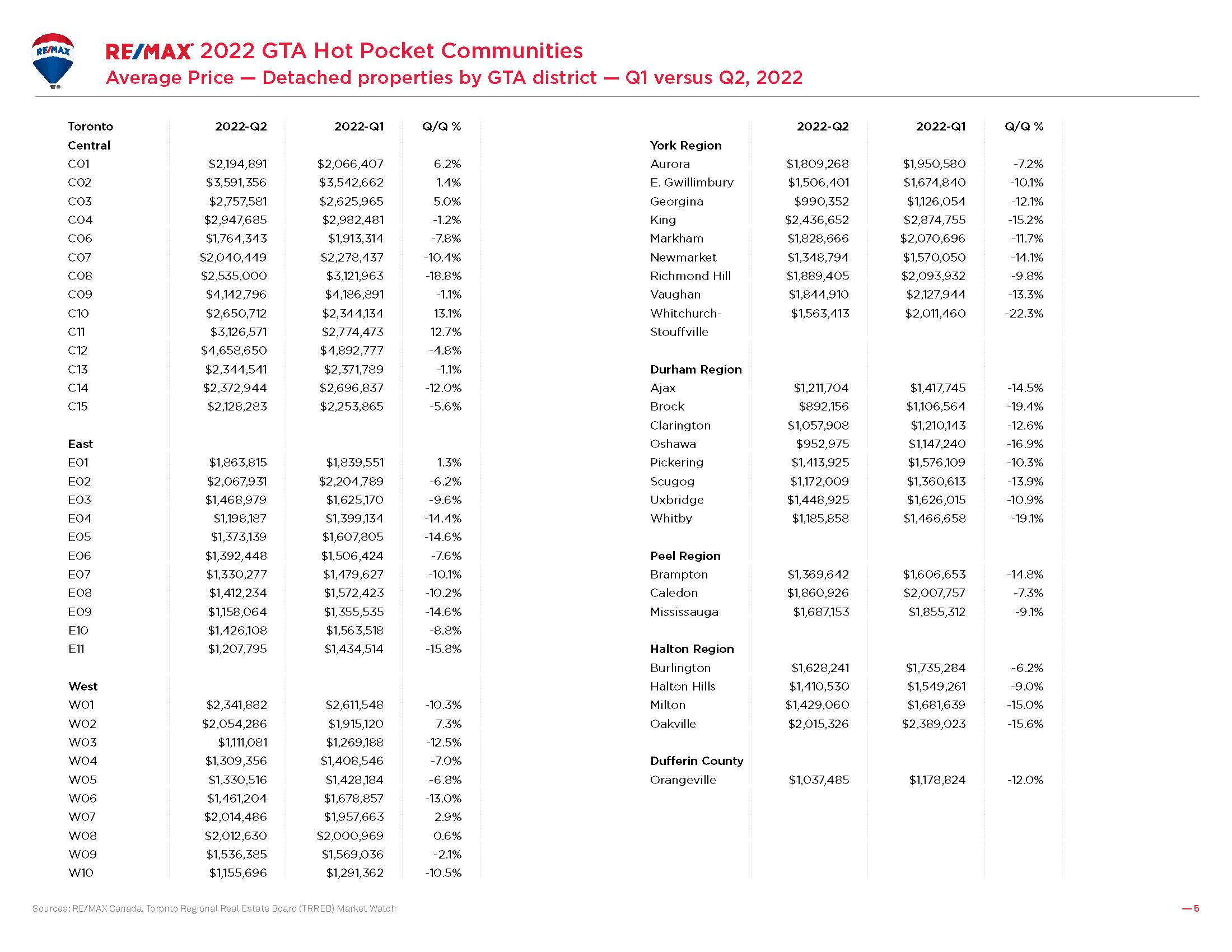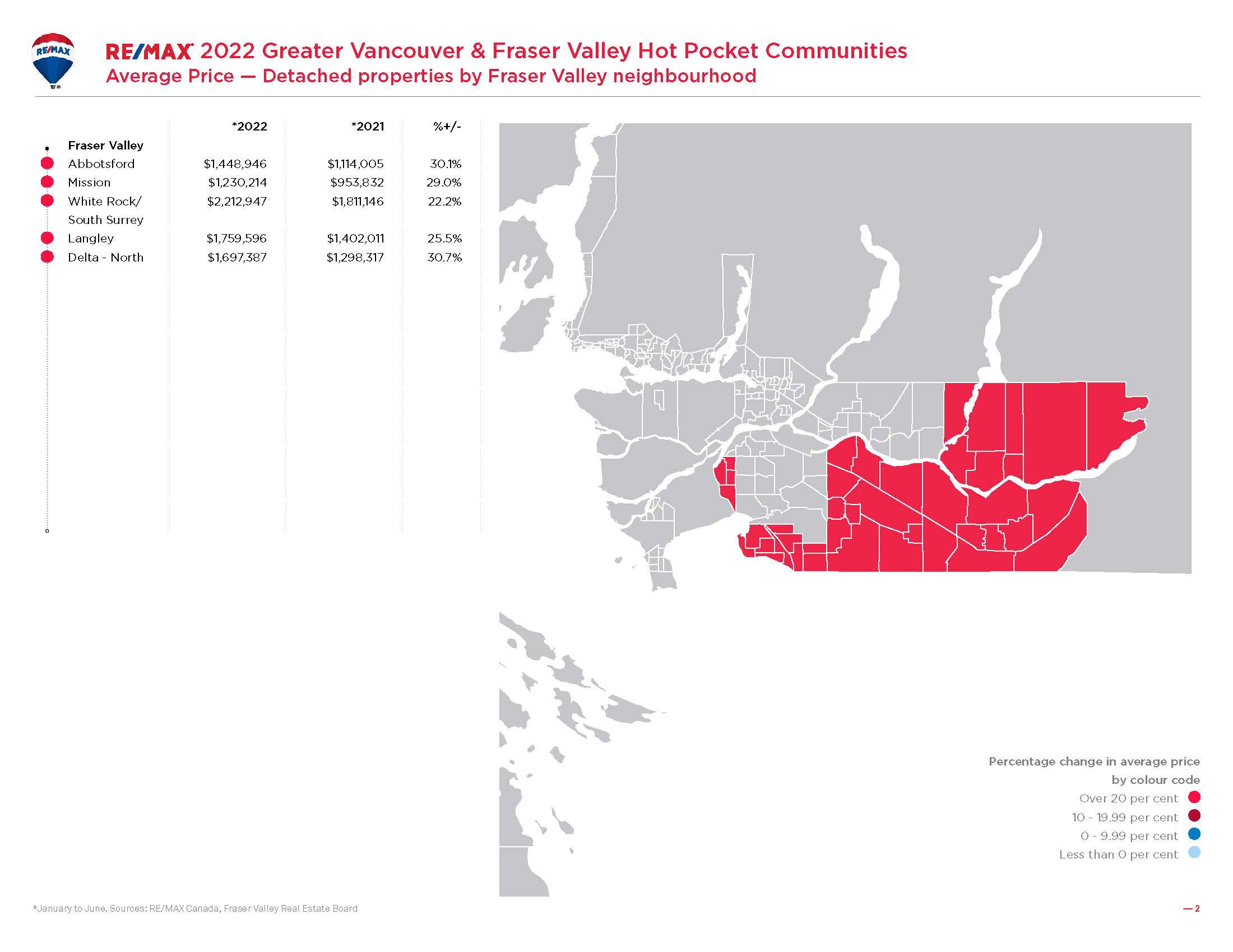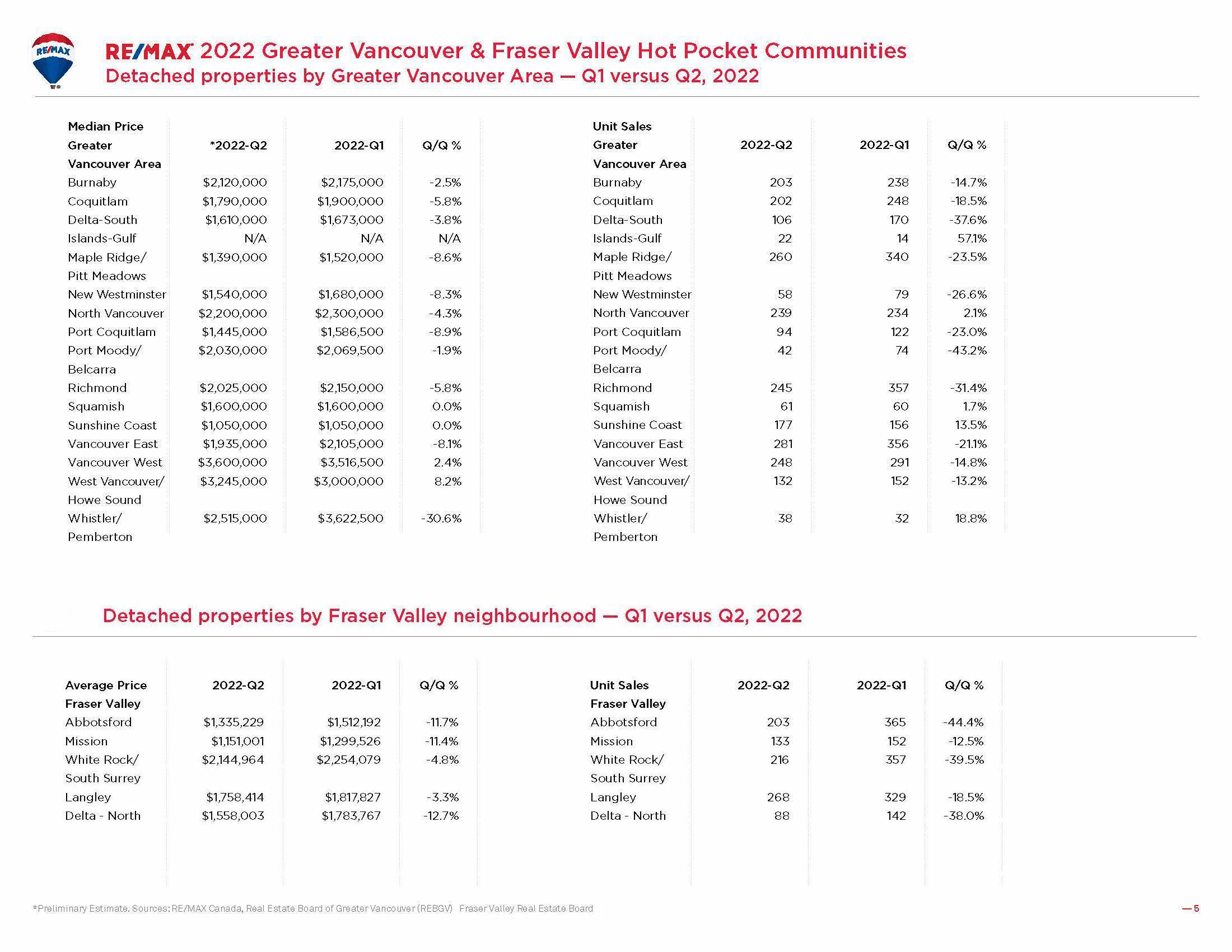 To illustrate, the RE/MAX Canada 2022 Hot Pocket Communities Report compared market activity in the first and second quarter of 2022 in terms of unit sales and prices, analyzing 60 Toronto Regional Real Estate Board (TRREB) districts and 16 regions within the Real Estate Board of Greater Vancouver (REBGV), and six areas in the Fraser Valley Real Estate Board (FVREB). In the Greater Toronto housing market, the Central and West End of the 416 held up relatively well in terms of average price while Durham, Peel, York, Halton and Dufferin surrendered some of the staggering gains realized in recent years. Preliminary estimates of Q2 median prices in Greater Vancouver’s Squamish area and the Sunshine Coast were comparable to first quarter figures, while West Vancouver and Vancouver West/Howe Sound reported moderate increases.