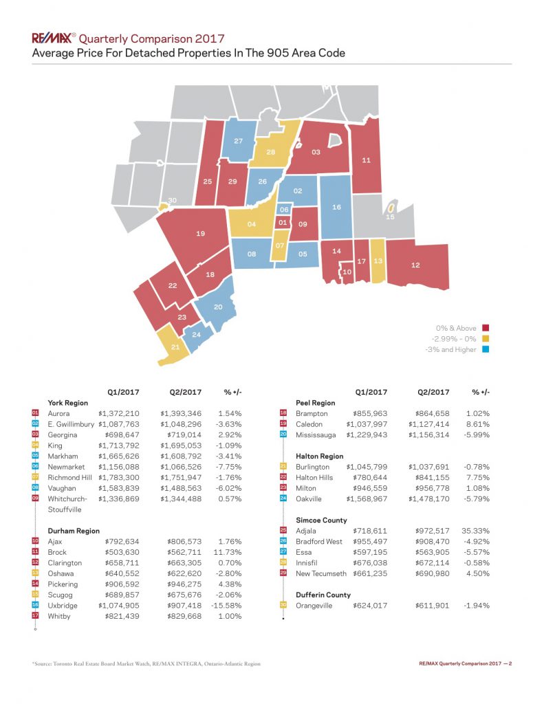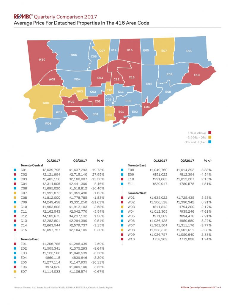 Against a backdrop of sliding home sales in the Greater Toronto Area (GTA), the average price of detached homes continued to rise in 40% of Toronto Real Estate Board (TREB) districts in the second quarter of 2017. We examined 65 neighbourhoods in the Greater Toronto Area in the first six months of the year, comparing first quarter performance to that in the second quarter.