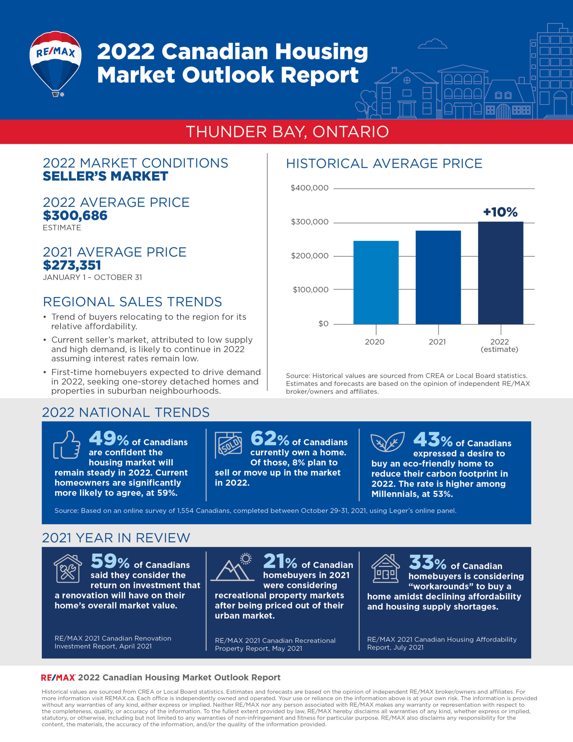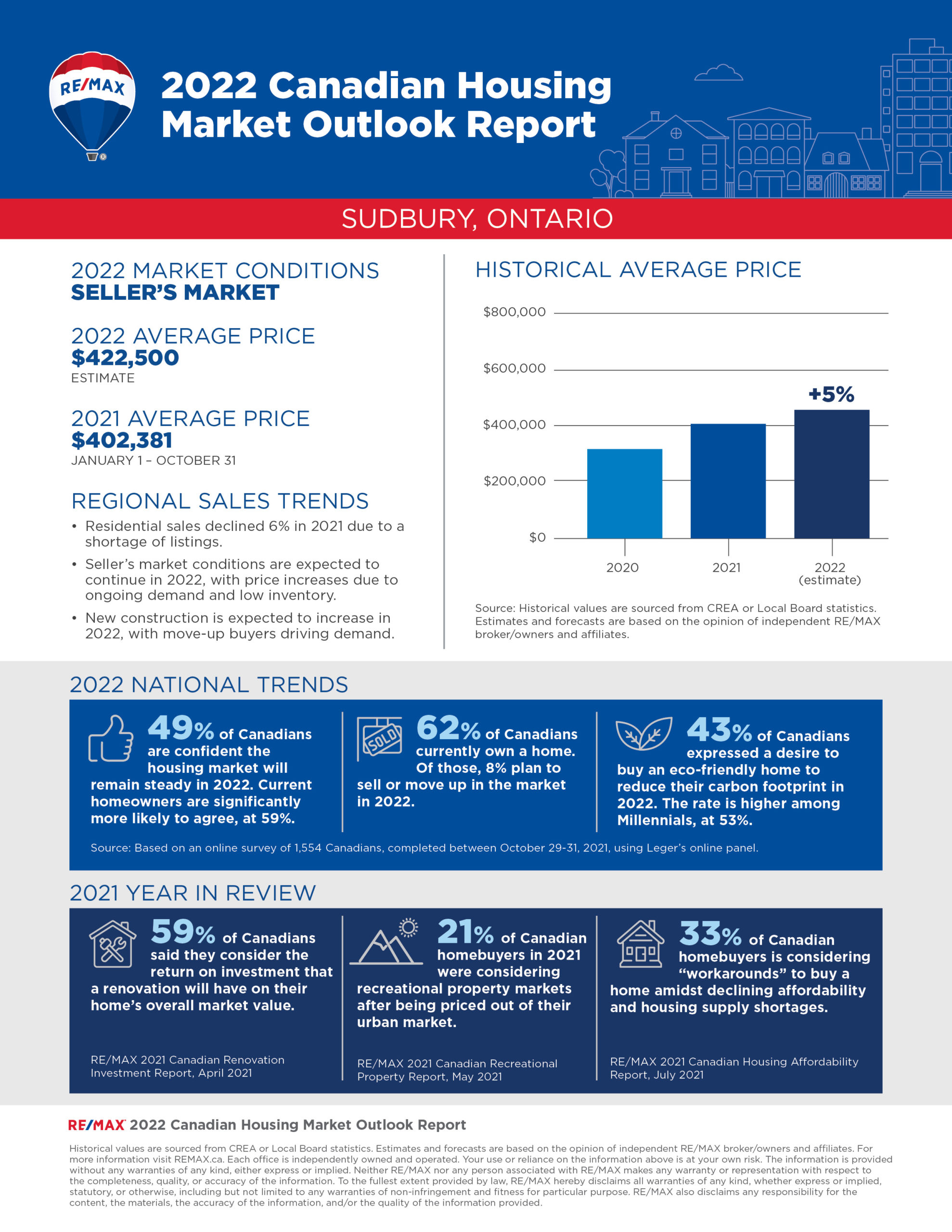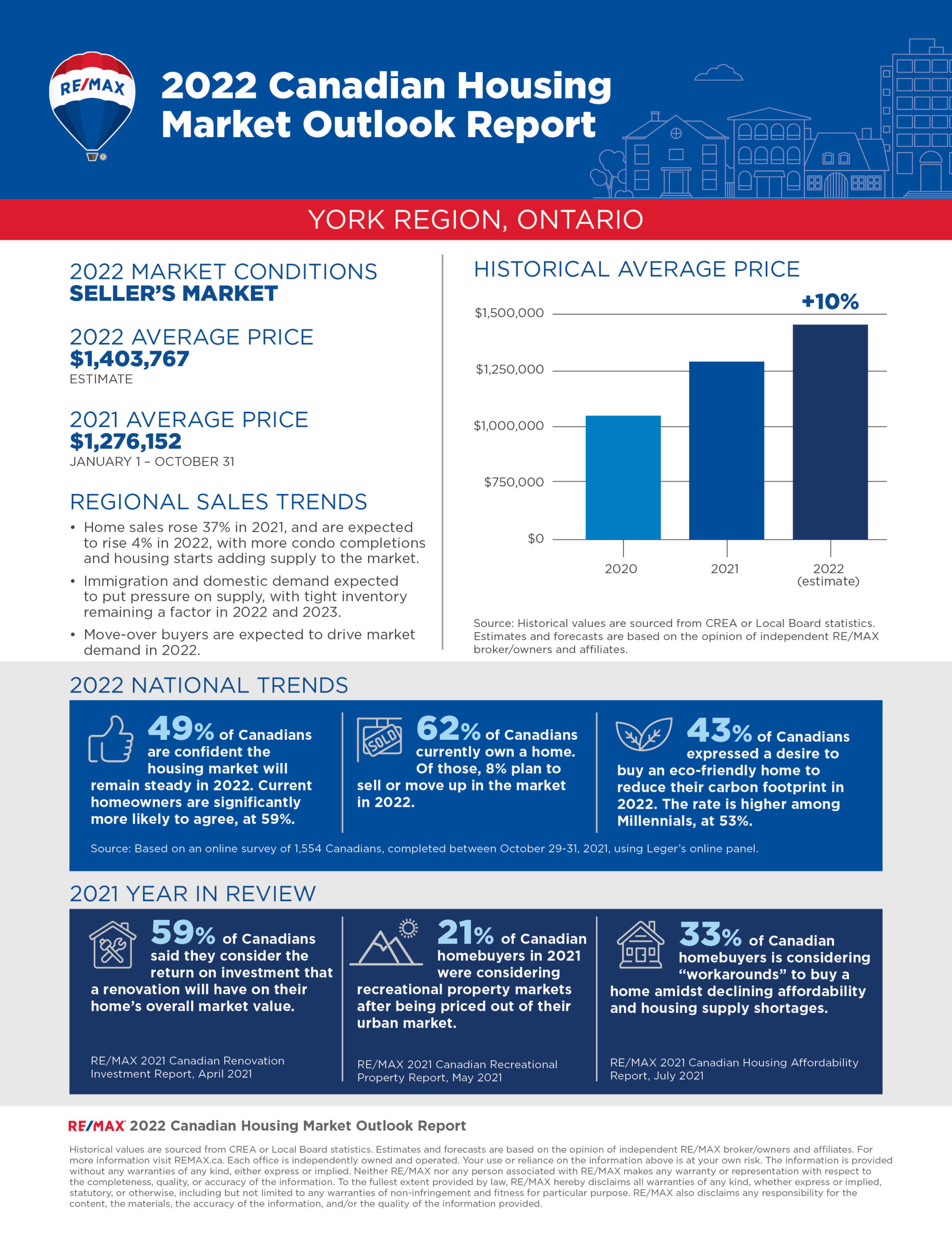 The 2022 RE/MAX Housing Market Outlook Report includes data and insights from RE/MAX brokerages. RE/MAX brokers and agents are surveyed on market activity and local developments. Regional summaries with additional broker insights can be found at REMAX.ca. The overall outlook is based on the average of all regions surveyed, weighted by the number of transaction in each region.