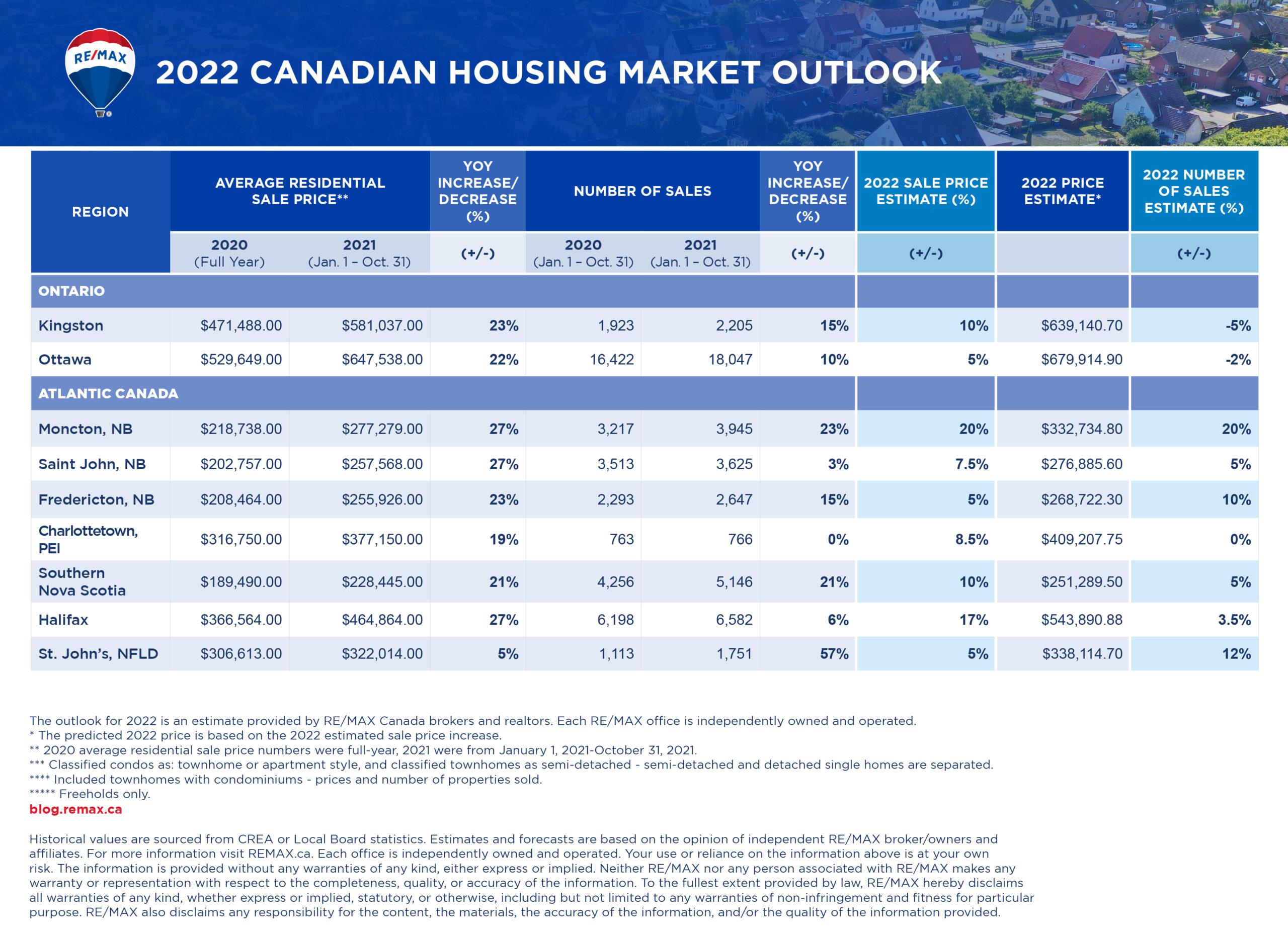 • Some of the highest outlooks are anticipated for Atlantic Canada, with Moncton and Halifax projecting average residential sales prices to increase by 20 per cent and 16 per cent respectively in 2022